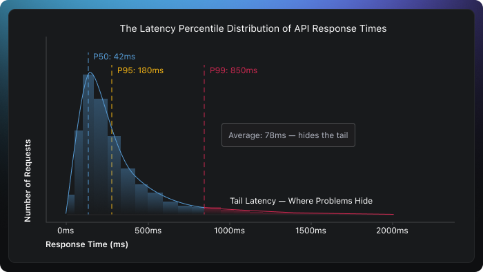 Here’s a mistake nearly every team makes early on: they track average response time, see a comfortable number like 75ms, and assume everything is fine. But averages can be misleading. They flatten the distribution and hide the fact that a meaningful chunk of your users might be waiting 2, 5, or even 10 seconds for a response.