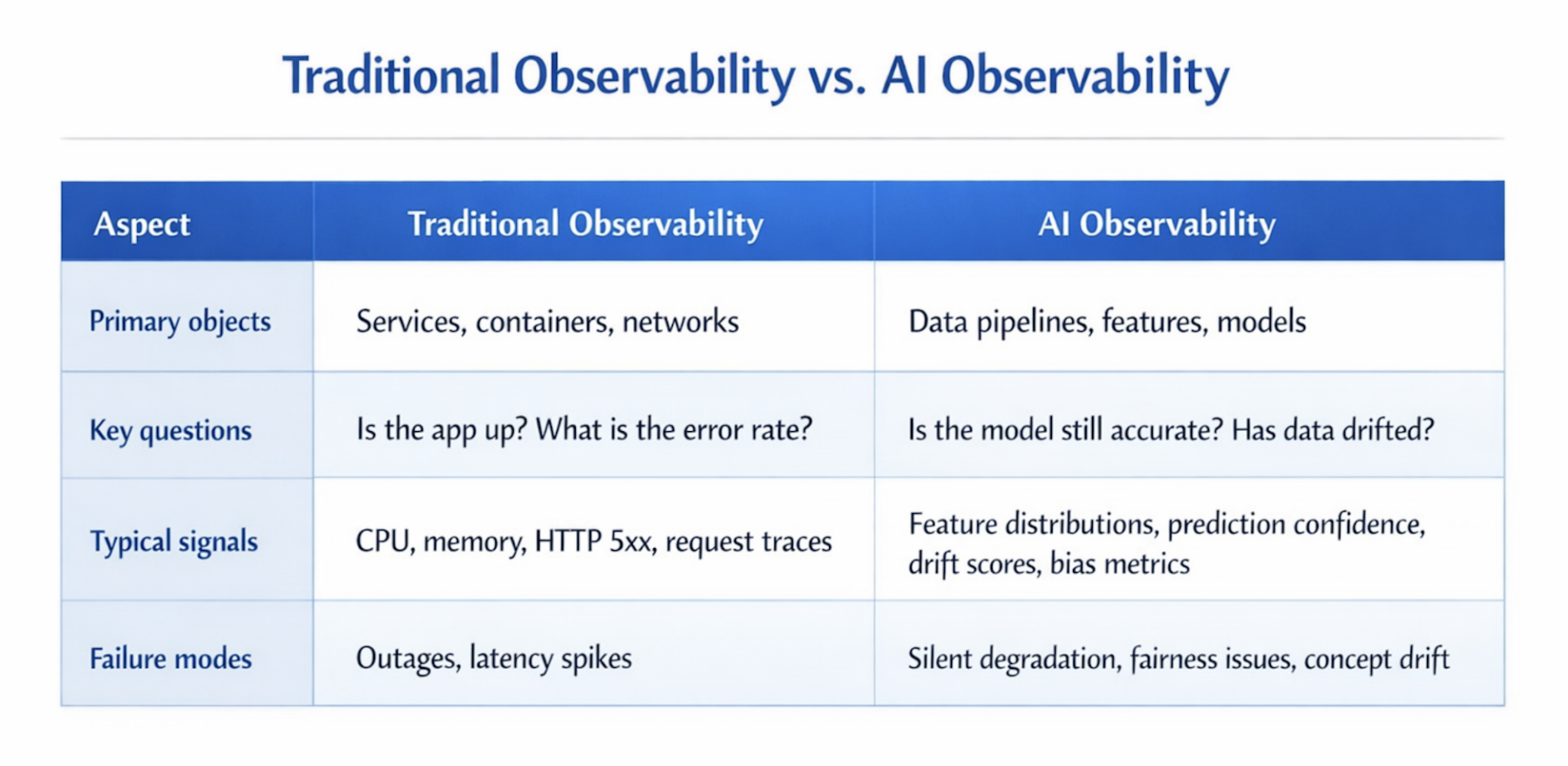 Traditional observability watches servers, databases, and APIs. It answers “What broke and where?” based on 3 pillars: logs, metrics, and traces. AI observability adds an extra dimension: Data and model quality.
