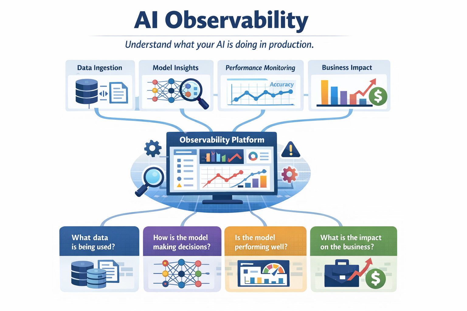 AI observability is the ability to understand what an AI system is doing, why it is doing it, and whether it is safe and effective to do so, while the system is running in production. It extends traditional observability beyond infrastructure and APIs to include data inputs, model behavior, outputs, and real-world impact.