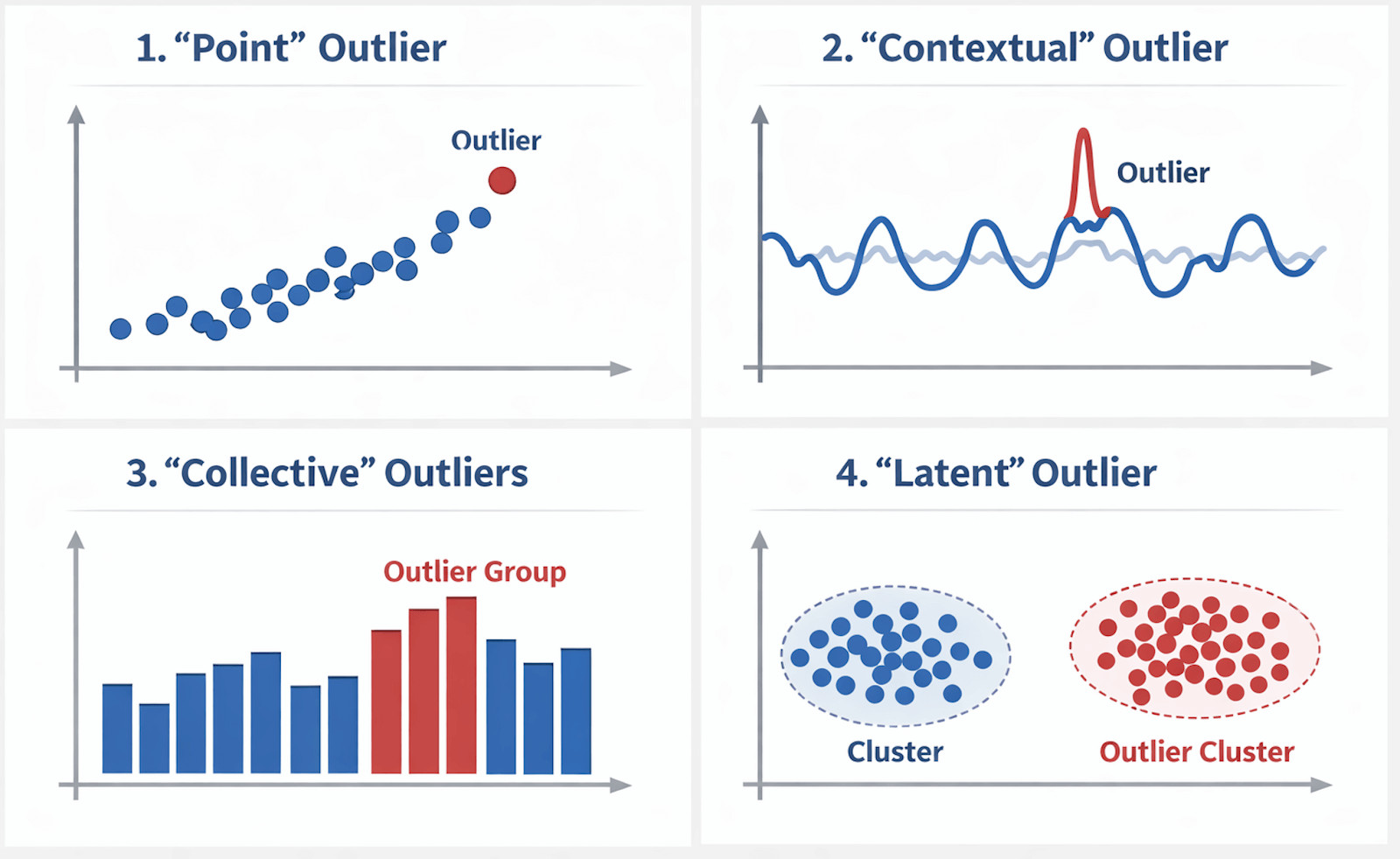 Before you decide how to catch anomalies, it helps to know the shapes they can take. Each type needs a slightly different outlier detection technique: