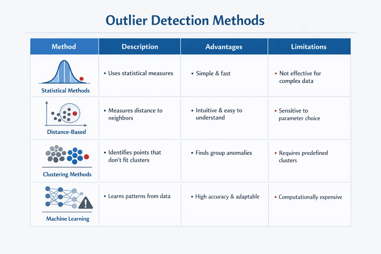 - k-Nearest Neighbours (k-NN) – Points with unusually sparse neighborhoods are deemed outliers.